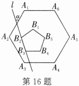 16. 如图,内角都相等的六边形$A_1A_2A_3A_4A_5A_6$的内部有一个内角都相等的五边形$B_1B_2B_3B_4B_5$,且$A_3A_4// B_3B_4$,直线$l$经过点$B_2$,$B_3$,求直线$l$与$A_1A_2$的夹角(即$\angle\alpha$)的度数。
