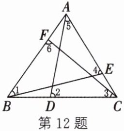 12. 如图,$D$,$E$,$F$分别是$\triangle ABC$的边$BC$,$AC$,$AB$上的点,则$\angle1+\angle2+\angle3+\angle4+\angle5+\angle6$的度数是(