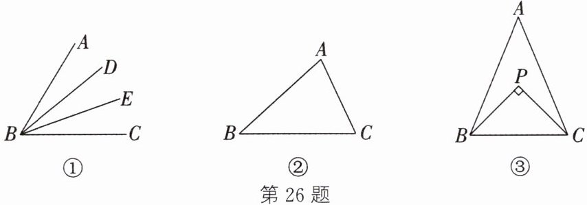 26. 【概念认识】如图①,在 $ \angle ABC $ 中,若 $ \angle ABD = \angle DBE = \angle EBC $,则 $ BD $,$ BE $ 叫作 $ \angle ABC $ 的“三分线”. 其中,$ BD $ 是“邻 $ AB $ 三分线”,$ BE $ 是“邻 $ BC $ 三分线”.