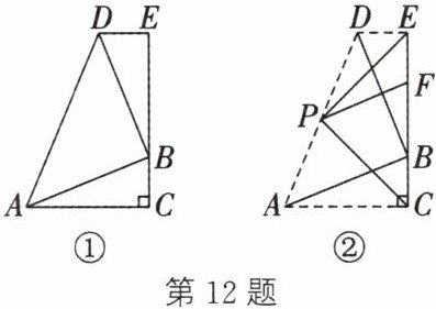 12. (数形结合思想)如图①,在$\triangle ABC$中,$\angle C = 90°$,$BC = a$,$AC = b$,$AB = c$,且$b > a$,将$\triangle ABC$绕一点按逆时针方向旋转到$\triangle BDE$的位置,点$A$,$B$,$C$的对应点分别为$B$,$D$,$E$,其中点$B$,$C$,$E$在同一条直线上,连接$AD$.