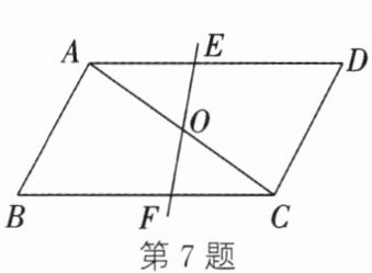 7. 如图,△ABC与△CDA关于点O对称,过点O作一直线EF分别交AD,BC于点E,F.有下列结论:①点E和点F,点B和点D分别关于点O对称;②直线BD必经过点O;③△AOE与△COF成中心对称;④四边形DEOC与四边形BFOA的面积必相等.其中,正确的个数为(