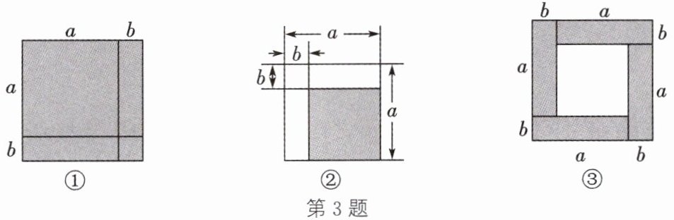 3. 如图,通过算 2 次的思想计算图中涂色部分的面积,可得到关于 $ a $,$ b $ 的等量关系.其中图①是