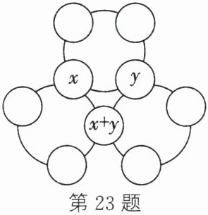 答案:23. 9 18 解析:因为每个圆圈上的四个数字的和都等于21,所以三个圆圈上的数字之和为$21 × 3 = 63$.因为数字1~9的和为$1 + 2 + 3 + 4 + 5 + 6 + 7 + 8 + 9 = 45$,所以$45 + x + y + x + y =63$,所以$x + y = 9$.因为$A + B + C = 411$,$1^{2} + 2^{2} + 3^{2} + 4^{2} + 5^{2} +6^{2} + 7^{2} + 8^{2} + 9^{2} = 285$,所以$285 + (x + y)^{2} + x^{2} + y^{2} = 411$,所以$(x + y)^{2} + x^{2} + y^{2} = 126$,所以$2(x + y)^{2} - 2xy = 126$,所以$2 ×9^{2} - 2xy = 126$,所以$xy = 18$.
