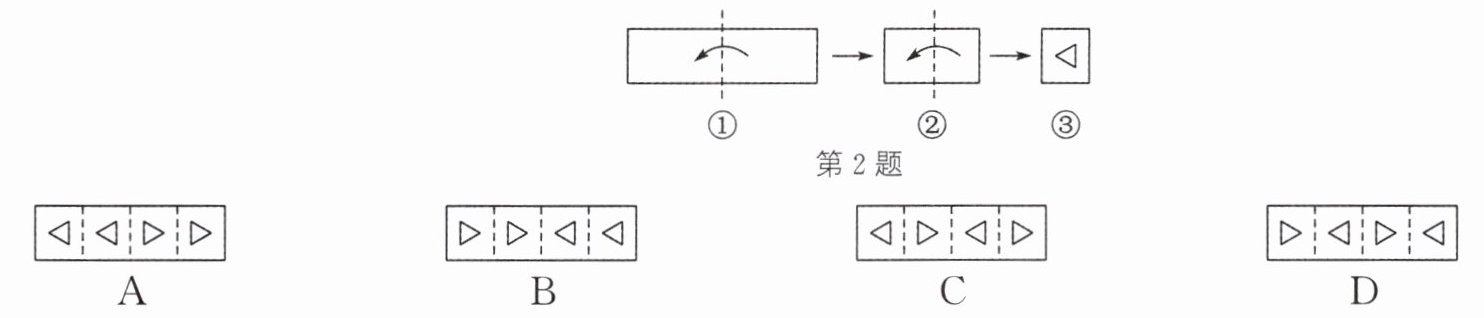 2. (易错题)把一张长方形纸片按如图①②所示的方式从右向左连续对折两次后得到图③,再在图③中挖去一个三角形小孔,则重新展开后得到的图形是(