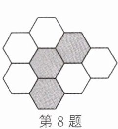 8. (新考法·操作实践题)如图所示为由8个边长相等的正六边形组成的图形,若在5个白色的正六边形中,选择2个涂灰,使被涂灰的2个正六边形和原来3个被涂灰的正六边形恰好组成轴对称图形,则选择的方案最多有
