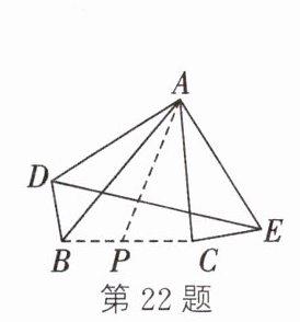 22. 如图,在三角形纸片 ABC 中,∠BAC = 45°,BC = 4,且 S△ABC = 10,P 为 BC 上一点,将纸片沿 AP 剪开,并将△ABP,△ACP 分别沿 AB,AC 向外翻折至△ABD,△ACE 的位置,连接 DE,则△ADE 面积的最小值为