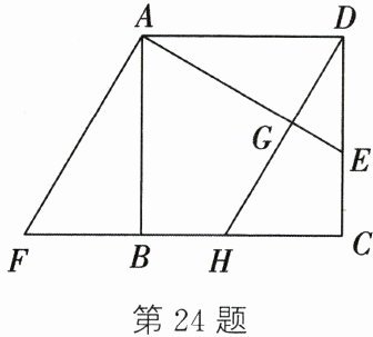 答案:24.(1)点$A$ $90$ (2)$\triangle AEF$是等腰直角三角形 理由:根据题意及(1),得$\triangle ADE$绕点$A$顺时针旋转后与$\triangle ABF$重合,所以$AF = AE$,$\angle FAE = \angle BAD = 90^{\circ}$,所以$\triangle AEF$是等腰直角三角形. (3)$AE = DH$,$AE⊥ DH$ 理由:因为$\triangle ABF$向右平移后与$\triangle DCH$重合,所以$AF = DH$,$AF// DH$,所以$\angle FAE = \angle HGE$.由(2),得$\angle FAE = 90^{\circ}$,$AF = AE$,所以$\angle HGE = 90^{\circ}$,$AE = DH$,所以$AE⊥ DH$.