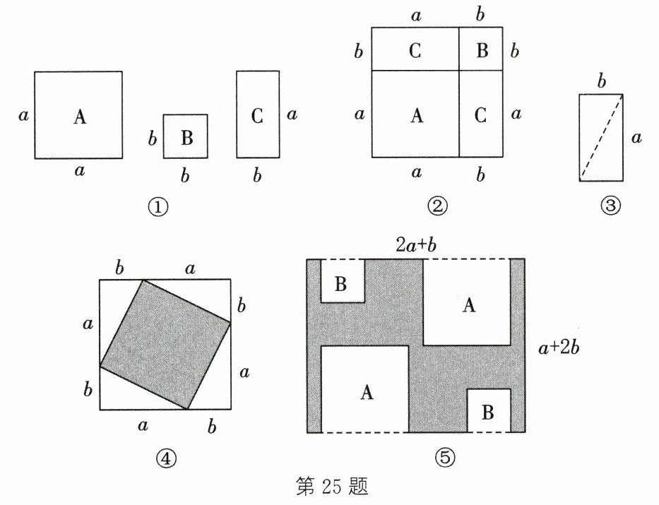 25. (10 分)如图①,现有 A,B,C 三种不同的卡片若干张,其中 A 型卡片是边长为 $ a $ 的正方形,B 型卡片是边长为 $ b(b < a) $ 的正方形,C 型卡片是长为 $ a $、宽为 $ b $ 的长方形.