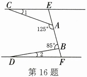 16. 如图,直线CE//DF,∠CAB = 125°,∠ABD = 85°,则∠1 + ∠2的度数为