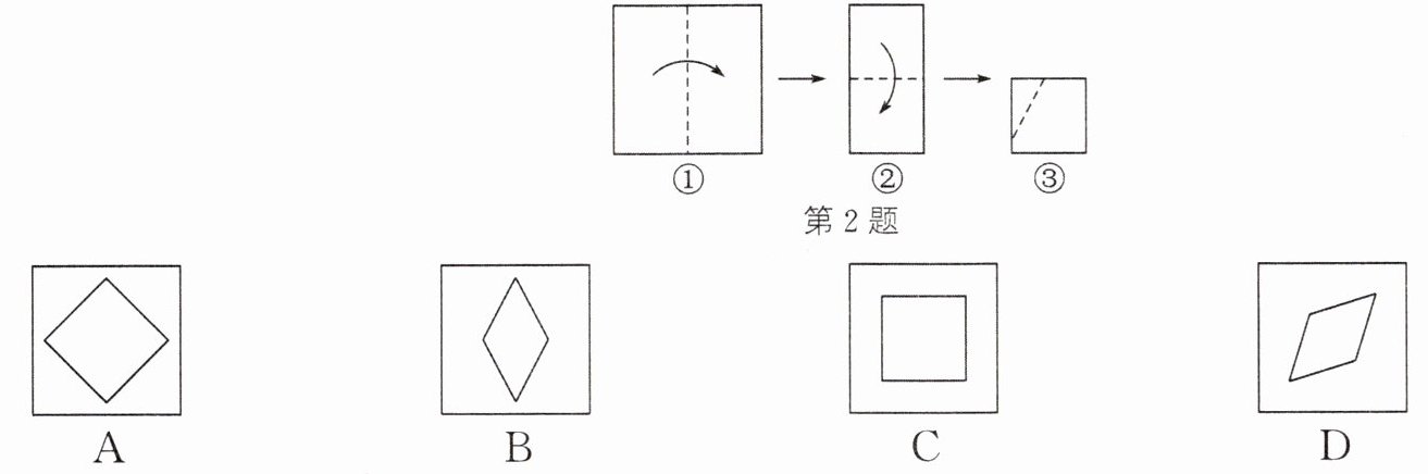 2. (易错题)如图①②,将一张正方形纸片沿虚线对折两次,然后沿图③中的虚线剪去一个角,展开铺平后的图形是(