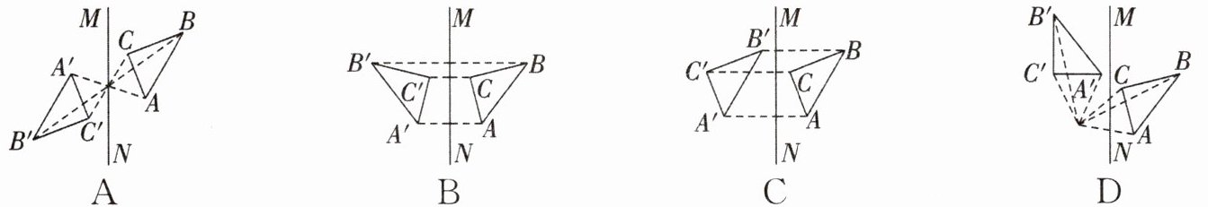 1. 下列图形中,$\triangle A'B'C'$与$\triangle ABC$关于直线$MN$成轴对称的是(