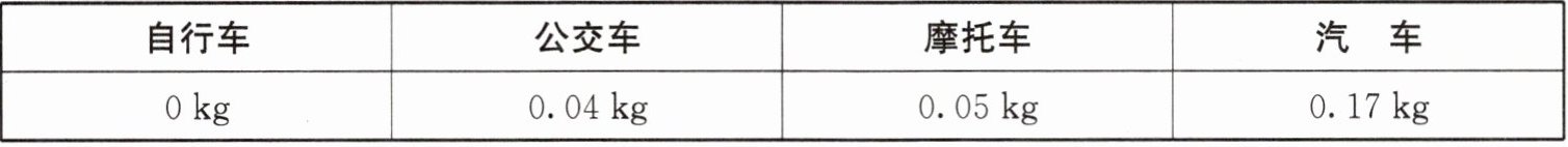 4. 小玲乘飞机旅游,已知她乘飞机产生的碳排放量为$800kg$,为了弥补这些碳排放量,她决定上下班时从驾驶汽车改成乘公交车。每人使用各种交通工具每移动$1km$产生的碳排放量如下表: