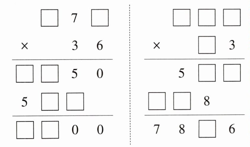 提示:第一个式子中,两个乘数的个位相乘,积的个位为0,第二个乘数十位上的3与第一个乘数的个位相乘,积的个位应为5,可知第一个乘数的个位为5;又因为第一个乘数的百位与3相乘加上进位的数是5,可判断第一个乘数为175。第二个式子中,积的末位为6,则第一个乘数的个位为2;第二个乘数十位上的数与第一个乘数相乘的积是约700的三位数,且个位为8,则第二个乘数为43;第一个乘数乘3等于5□6,则第一个乘数的百位上是1,十位上是7或8或9,172×43 = 7396,182×43 = 7826,192×43 = 8256,所以第一个乘数是182,根据182×43推算出其他□里的数字。