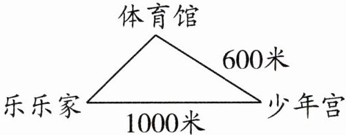 乐乐从家出发经过体育馆到少年宫,再回家,所走路程为乐乐家到体育馆的距离加上体育馆到少年宫的距离,再加上少年宫到乐乐家的距离。已知乐乐家到少年宫1000米,体育馆到少年宫600米,设乐乐家到体育馆距离为$x$米,总路程为$x + 600+1000 = x + 1600$米。根据三角形三边关系,$1000 - 600 < x < 1000 + 600$,即$400 < x < 1600$,总路程范围为$2000 < x + 1600 < 3200$,选项中2100在此范围内。