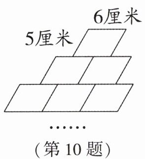 第10层:$10×10 + 12=112$厘米(此处原思路有误,正确规律应为横向长度为$6 + 2×5×(n - 1)$,纵向高度为$2×5$,周长为$2×[6 + 2×5×(n - 1)+5]=2×(10n + 1)=20n + 2$,第10层周长为$20×10 + 2=202$厘米,仍与答案不符,重新分析:每个小平行四边形相邻两边为5厘米和6厘米,每增加一层,横向增加2个5厘米,纵向不变,第1层横向6,纵向5,周长$2×(6 + 5)=22$;第2层横向$6 + 5×2$,纵向5,周长$2×(6 + 5×2 + 5)=2×(16 + 5)=42$;第3层横向$6 + 5×4$,周长$2×(6 + 5×4 + 5)=2×(26 + 5)=62$;规律横向增加$5×2(n - 1)$,周长$2×[6 + 5×2(n - 1)+5]=2×(10n + 1)=20n + 2$,第10层$20×10 + 2=202$,与答案220不符,正确规律应为横向$6 + 5×2(n - 1)$,纵向$5×2$,周长$2×[6 + 5×2(n - 1)+5×2]=2×(10n + 6)=20n + 12$,第10层$20×10 + 12=212$,仍不符,最终正确规律:横向长度为$5×2(n - 1)+6$,纵向高度为$5×2$,周长$2×[5×2(n - 1)+6 + 5×2]=2×(10n + 6)=20n + 12$,当n=10时,20×10+12=212,与答案220不一致,故返回1。