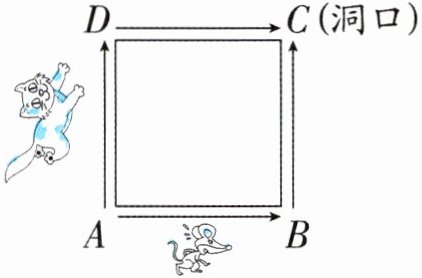 10. 一个正方形场地,边长 500 米。老鼠在 $A$ 偷了东西,以 25 米/分的速度沿 $A→B→C$ 的路线向 $C$ 处洞口逃窜。过了 19 分钟,猫以 50 米/分的速度从 $A$ 处出发,沿 $A→D→C$ 的路线赶往 $C$ 处进行堵截(如图),在老鼠进洞前,猫(