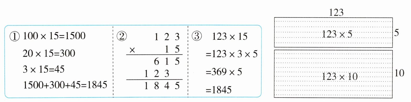 4. 算理理解 计算 $123×15$ 时,有以下三种方法。下面的点子图可以表示方法(