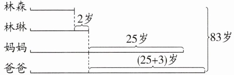 分析:林琳比妈妈小 25 岁,爸爸比妈妈大 3 岁,那么林琳就比爸爸小了(25 + 3)岁;林琳比弟弟大 2 岁。现在一家人的年龄加在一起是 83 岁,以林琳的年龄为标准,画图: