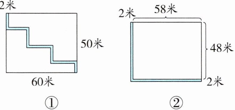 答案:分析:如图②,将左下方空白部分的图形向右平移2米,再向上平移2米,空白部分就能转化成一个长58米、宽48米的长方形。