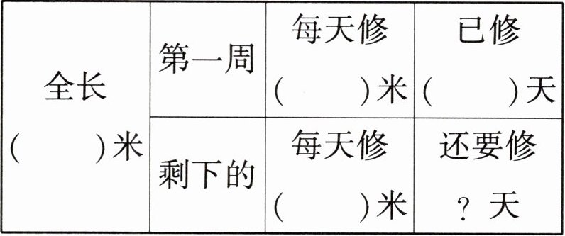 2. 一个修路队要修一条800米长的马路。第一周(一周按5天算)平均每天修70米,剩下的每天修90米,还要修多少天?(先填表整理,再解答)