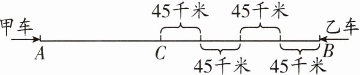分析:因为甲、乙两车的速度是已知的,所以要求 $ A $、$ B $ 两地之间的距离,需要先求出它们的相遇时间。设两车在 $ C $ 处相遇,通过画图分析可知,它们相遇时所用的时间即为乙车行 $ BC $ 段所用的时间,而 $ BC $ 段也是甲车 $ 4 $ 小时(相遇后)行的路程。根据这两个数量关系可求出甲、乙两车相遇时所用的时间。