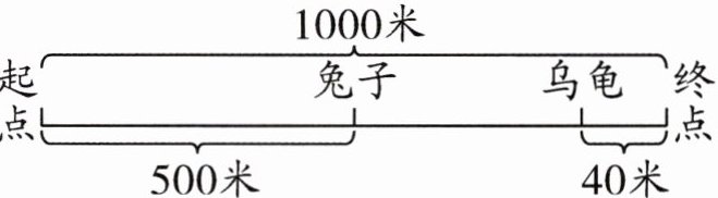 当兔子醒来时,乌龟距离终点只有 $ 40 $ 米,乌龟需要 $ 40 ÷ 10 = 4 $(分钟)就能到达终点,而兔子距离终点还有 $ 1000 ÷ 2 = 500 $(米),需要 $ 500 ÷ 100 = 5 $(分钟)才能到达,$ 5 > 4 $,所以乌龟胜利了。