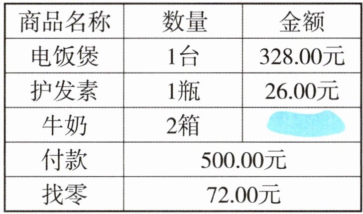 1. 爸爸发现一张购物小票被弄脏了,你能帮他算一算被弄脏处的金额吗?