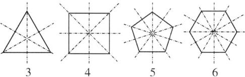 5. 归纳法 下面的每个图形中每条边都相等。画出它们的对称轴,分别有几条?你能发现什么规律?