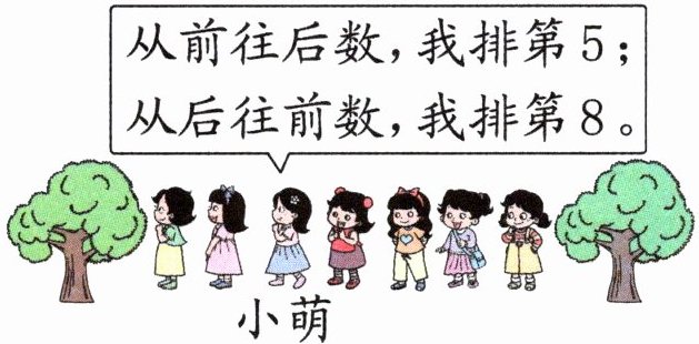 方法二:根据题意,从前往后数,小萌排第5,从后往前数,她排第8,5+8=13(人),因为从前往后数和从后往前数,小萌算了2次,所以再用13−1求出这队一共有12人。