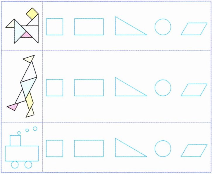 3. (生活应用)拼成下面左边的图案分别用了哪几种图形?在右边圈一圈。