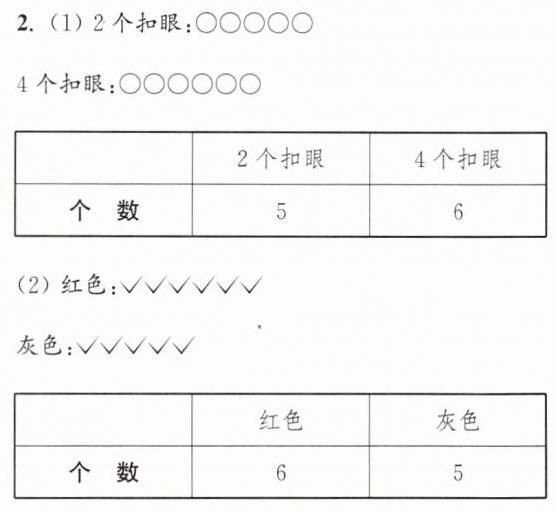 2. (生活应用)把下面的纽扣分成两组,可以怎么分?请用不同的方法表示分类结果。