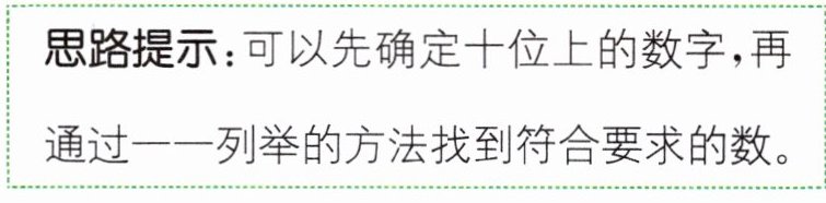 思路提示:可以先确定十位上的数字,再通过一一列举的方法找到符合要求的数。