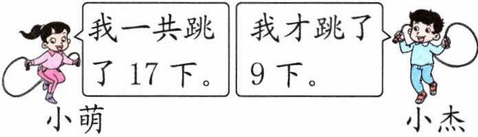 解析:小杰跳的少,小萌跳的多,小杰再跳$ 17 - 9 = 8 $(下)就和小萌跳的同样多,所以要想超过小萌,至少再跳$ 8 + 1 = 9 $(下)。