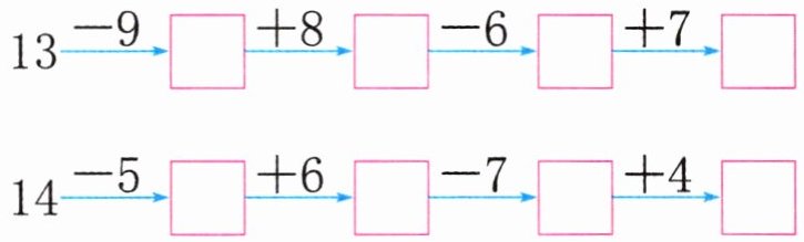 $13 \stackrel { - 9 } { \to } □ \stackrel { + 8 } { \to } □ \stackrel { - 6 } { \to } □ \stackrel { + 7 } { \to } □$