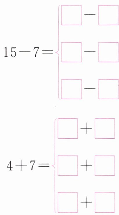 $15 - 7 = \{ \begin{array} { l } { □ - □ } \\ { □ - □ } \\ { □ - □ } \end{array}$