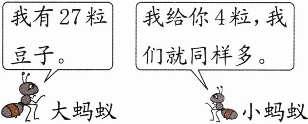 )粒豆子。答案:8. 35 解析:小蚂蚁给大蚂蚁4粒,它们的豆子就同样多,都是27+4=31(粒),再加上小蚂蚁给出的4粒,则小蚂蚁原来有31+4=35(粒)豆子。
