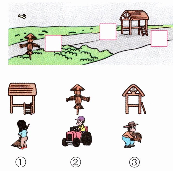 5.(思维过程)三人参加劳动时分别看到了以下三幅图,想一想,这三人分别是在哪个位置劳动的?在$□$里填写相应的序号。