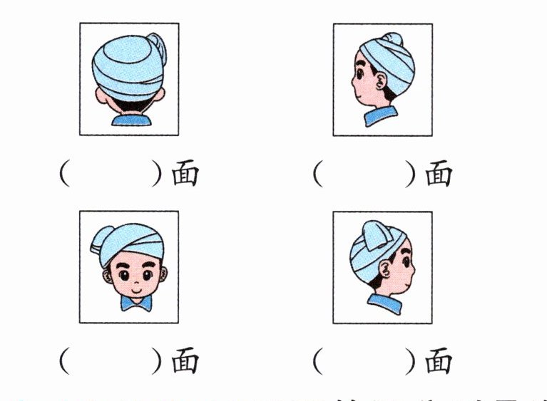 2. 下面的照片分别是在小亮的哪一面拍到的?填一填。