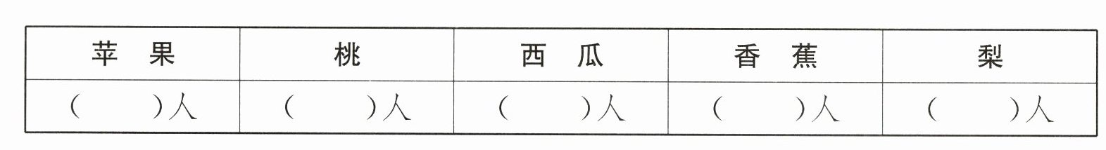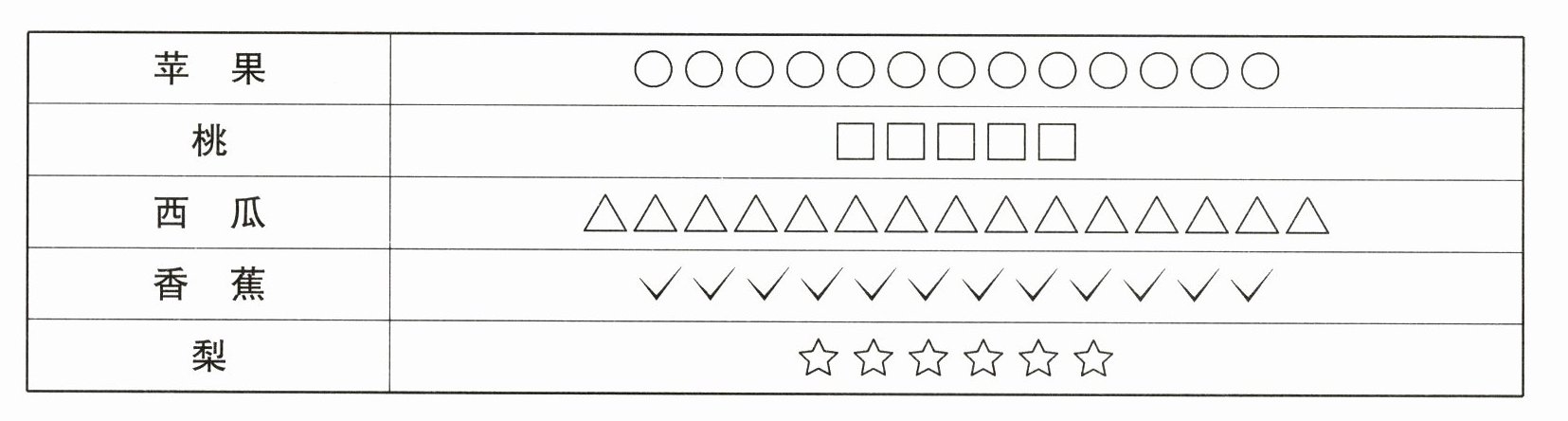 五、儿童节这天,一年级一班举行联欢会,几名同学调查了全班同学最喜欢吃的水果情况,并用不同图形记录了分类结果。(共 9 分)