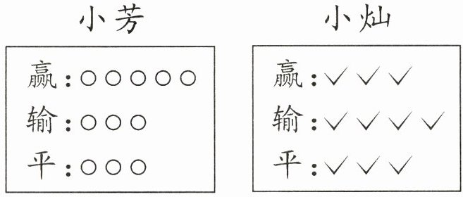 七、小芳和小灿比赛下棋。两人一共比赛了 10 次,观察下面两人的记录,你觉得谁的记录出错了?请你写出理由,并将错误的记录修改正确。(共 8 分)