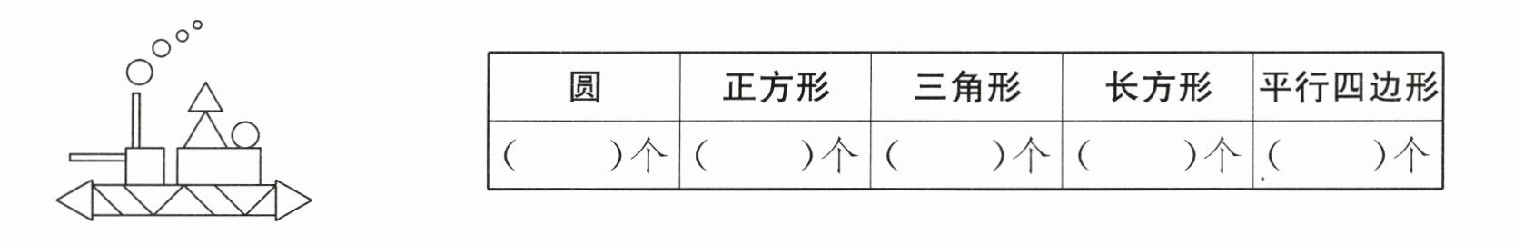 解析:数平行四边形时,先数单个的图形,有 2 个,再数由 2 个图形组合成的,有 1 个,接着数由 3 个图形组合成的,有 3 个,最后数由 4 个图形组合成的,有1 个,一共有 2 + 1 + 3 + 1 = 7(个)。