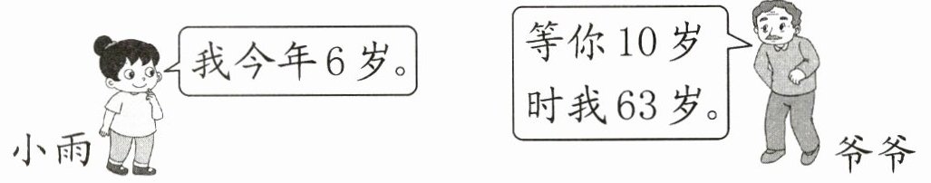 解析:方法一,可以抓住两人的年龄差不变,当小雨 $10$ 岁时,爷爷 $63$ 岁,那么两人相差 $53$ 岁,再用小雨今年的年龄加上年龄差,即 $53 + 6 = 59$(岁),就是爷爷今年的年龄;方法二,可以想:小雨从 $6$ 岁长到 $10$ 岁,要过 $10 - 6 = 4$(年),$4$ 年后爷爷是 $63$ 岁,那么爷爷今年就是 $63 - 4 = 59$(岁)。