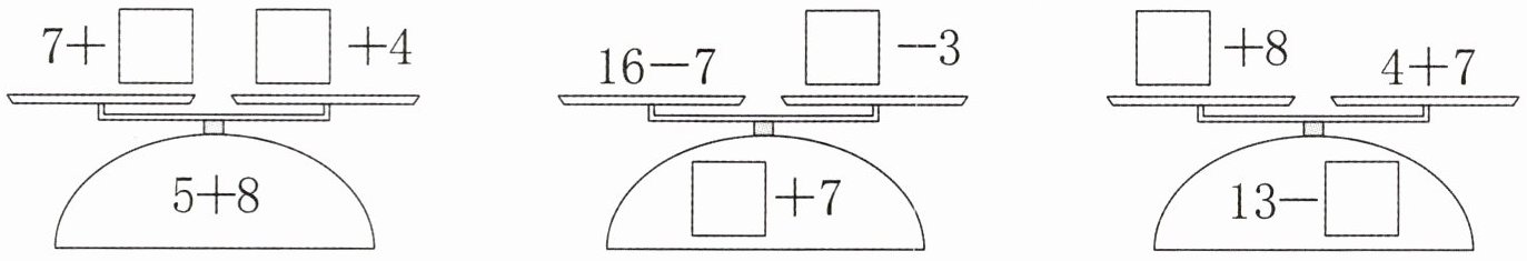 3. 下面每架天平上算式的得数相同,在$□$里填合适的数。