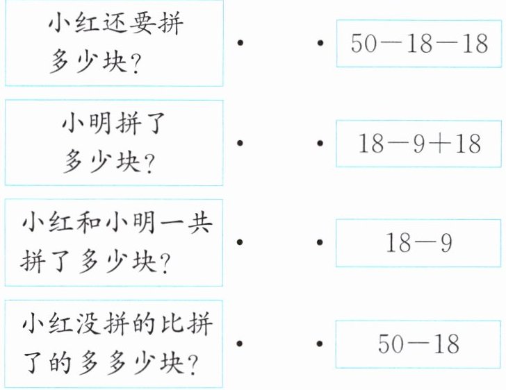 小红和小明的拼图各有50块,小红拼了18块,小明比小红少拼了9块。