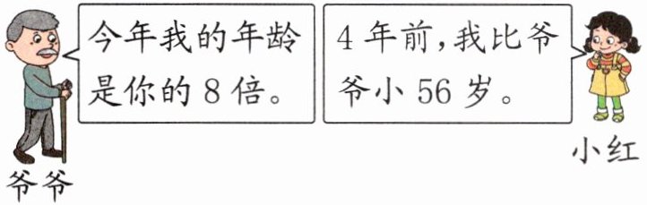 爷爷:8×8=64(岁) 解析:4年前,小红比爷爷小56岁,4年后,小红依然比爷爷小56岁。如图,将小红今年的年龄看成1份,爷爷今年的年龄就有这样的8份,爷爷的年龄比小红的年龄多7份,则其中的一份是56÷7=8(岁),也就是小红今年的年龄。所以爷爷今年的年龄是8×8=64(岁)。