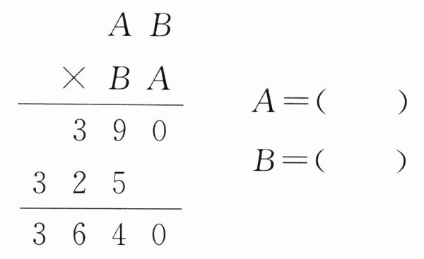 答案:7. 6 5 解析:通过观察竖式,可以发现$B× A=\boxed{0}$;$A× A = 3\boxed{0}$;$B× B=\boxed{5}$。根据乘法口诀不难推算出B=5,A=6,进而通过计算65×56进行验证,看得到的积是不是3640。