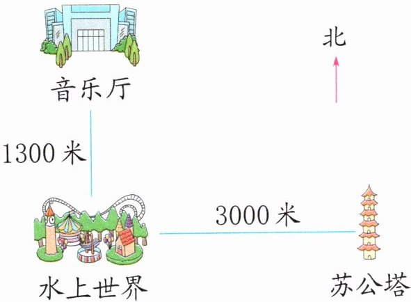 (2)如果王叔叔是往东走的,那么他现在大概走到了什么位置?在图中用“☆”表示出来。这时王叔叔离苏公塔还有多少米?