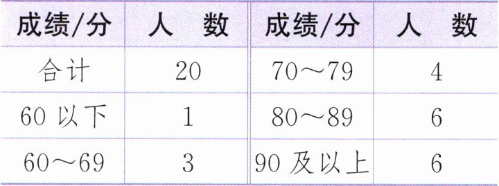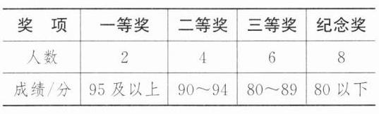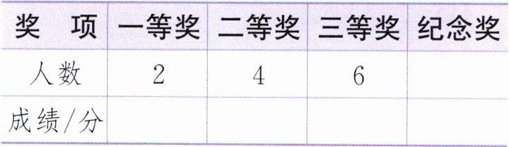解析:一共有20人,一等奖2人,二等奖4人,三等奖6人,所以纪念奖有20−2−4−6=8(人)。根据参赛同学的成绩由高到低的顺序和奖项人数合理设定分数段即可。