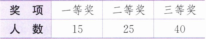 1. (连云港真题)中华小学举行汉字书写大赛,成绩在 $ 90 ∼ 100 $ 分是一等奖,$ 80 ∼ 89 $ 分是二等奖,$ 70 ∼ 79 $ 分是三等奖。获奖情况统计如下表: