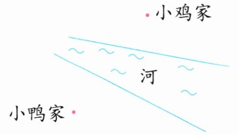 6. (创新应用)小鸭在岸上走路比较吃力,但它擅长游泳,小鸭想去小鸡家玩,怎样去最省力?请画出路线。
